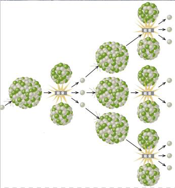 核裂变反应原理示意图。图中灰色小球为中子,较大的“复合”球为铀原子核,较小的“复合”球为反应生成的新原子核