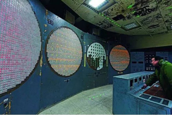 在主控制室,安放着当时国内最先进的计算机机体,计算机控制台正对的4个直径约2米的圆形控制盘上,分序号标注了2001个小孔,这些小孔一边同主控室内的计算机相连,一边同核反应堆内的2001个核反应孔相连。