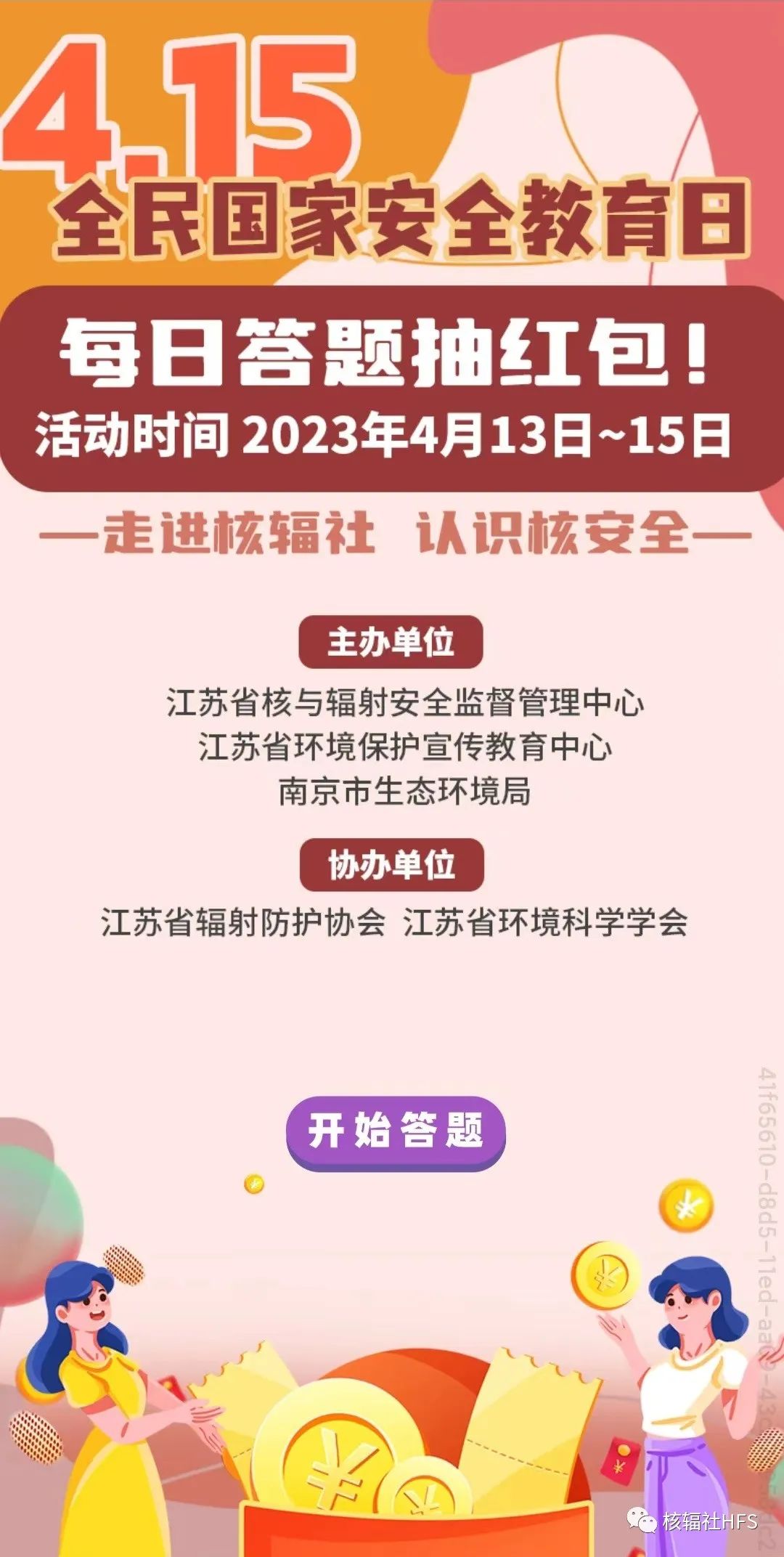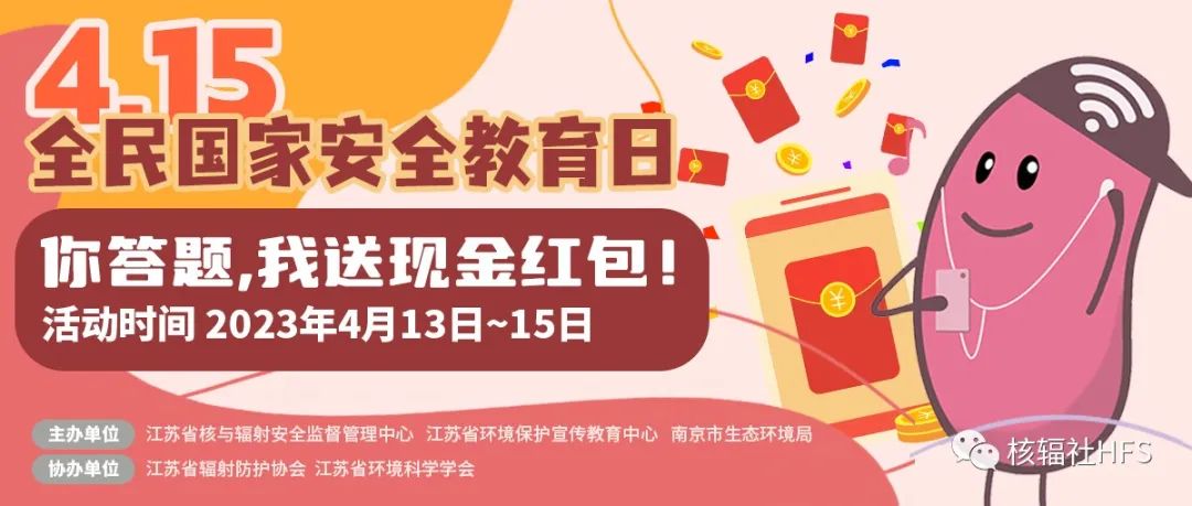 今年4月15日是第八个全民国家安全教育日。4月13日~15日,核辐社推出了“你答题,我送现金红包”的主题活动。辐蛙社长为大家准备了数量多多的微信现金红包。保证让您学得充实,玩得尽兴,红包拿不停!