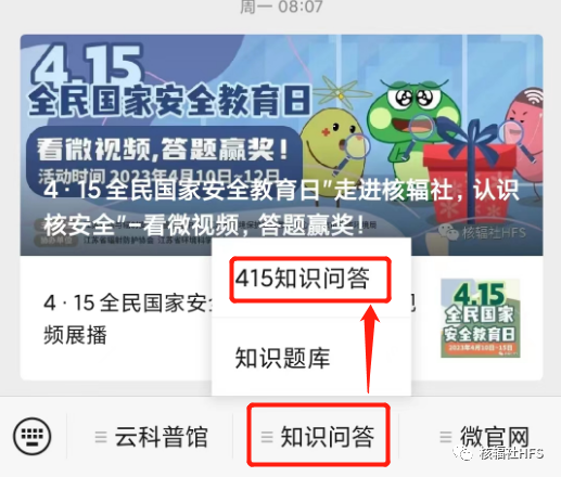3.获取答题攻略。你们一定会问,答不出来怎么办,辐蛙社长早已为大家做好了准备,答题前先点击“知识题库”预先学习,活动开始时答题才事倍功半哦!点击【知识问答】→【知识题库】获取题库内容,开始了解有趣的核与辐射知识吧!