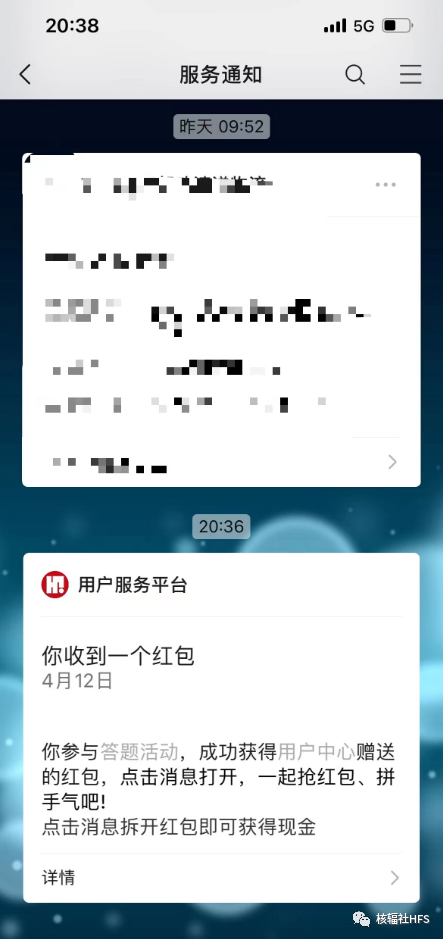 小伙伴们答完题以后,不要忘记回到“服务通知”领取抽到的红包奖励哦!