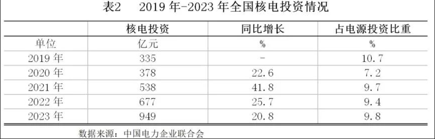 2023年,核电投资快速增长,主要系受益于项目审批开工提速。2023年1-12月份,核电完成投资949亿元,同比增长20.8%,所占比重为9.8%,较2022年同期提高0.4个百分点。