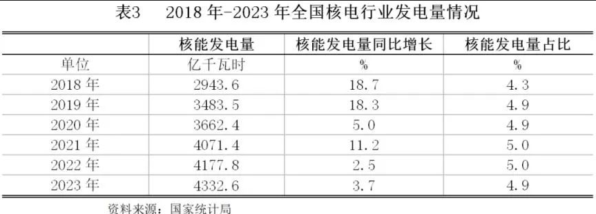 2023年,在核电机组利用率有所提升的驱动下,核电生产表现稳健。国家统计局数据显示,2023年,全国运行核电机组累计完成发电量4332.6亿千瓦时,同比增长3.7%,增速较2022年同期提高1.2个百分点。
