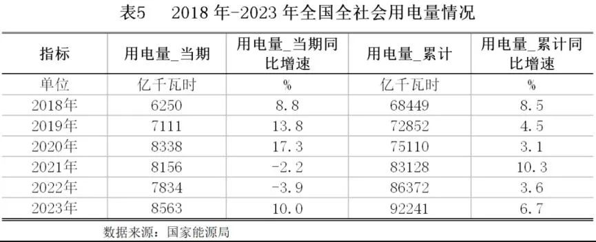 2018年以来,我国全社会用电量保持增长,这与我国经济不断发展有较大的关系,但增速呈波动走势。2023年以来,我国“双碳”工作积极推进,能源结构持续优化,全国电力系统安全稳定运行,电力供需总体平衡,用电增速呈恢复性增长态势。经济修复拉动用电需求上行。2023年,国内经济回升向好,对电力消费形成有效支撑,用电需求复苏上行,国家能源局数据显示,2023年1-12月份,全社会用电量累计92241亿千瓦时,同比增长6.7%,增速较2022年同期提高3.1个百分点。