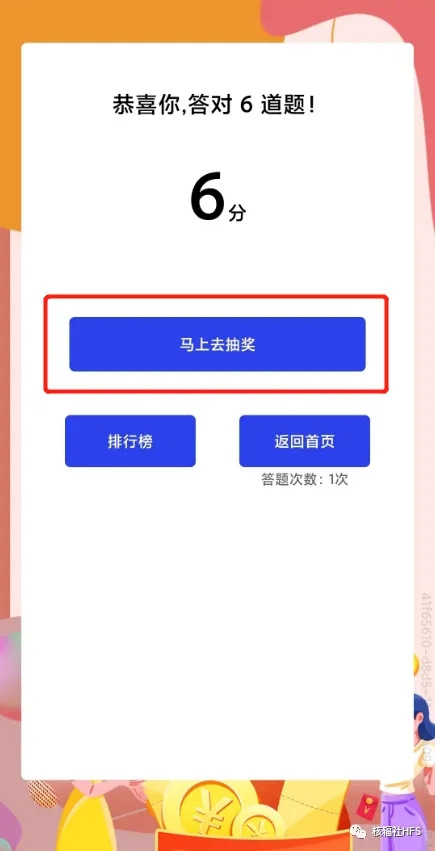 完成答题,即有机会抽取红包奖励哦!(根据规则答对一定数量的题目,即有机会参与抽奖,数量有限,先对先得哦!)