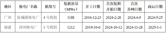 1)漳州核电厂1号机组2024年10月12日装料,本表格中发电量及上网电量数据为调试期间电量,能力因子暂无数据。