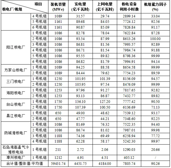 3)本表“合计值/整体值/平均值”中,装机容量、发电量、上网电量为各机组合计值,核电设备利用小时数为全部机组整体值,机组能力因子为全部参与统计机组的算数平均值。