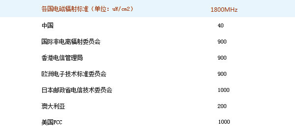 规定指出,通信频段功率密度应小于40微瓦/平方厘米,与欧洲1800MHz的900微瓦/平方厘米、美国FCC的1000微瓦/平方厘米相比,前、后分别相差20倍与25倍。再来看看离我们最近的香港,香港电信管理局规定(1800MHz)的电磁辐射标准为900微瓦/平方厘米,两者相差20倍,可见大陆对电磁辐射把控的严格。