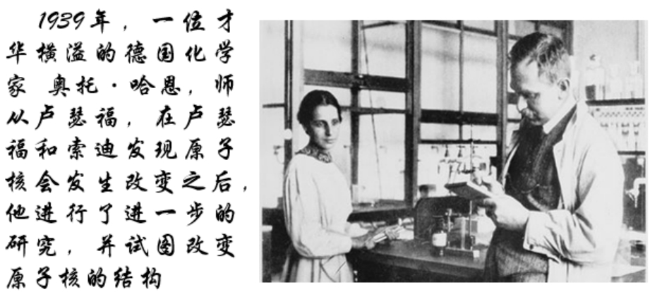 这时候德国柏林传来消息,卢瑟福的一位才华横溢的学生,也就是德国化学家 奥托·哈恩正在进行原子核的研究。