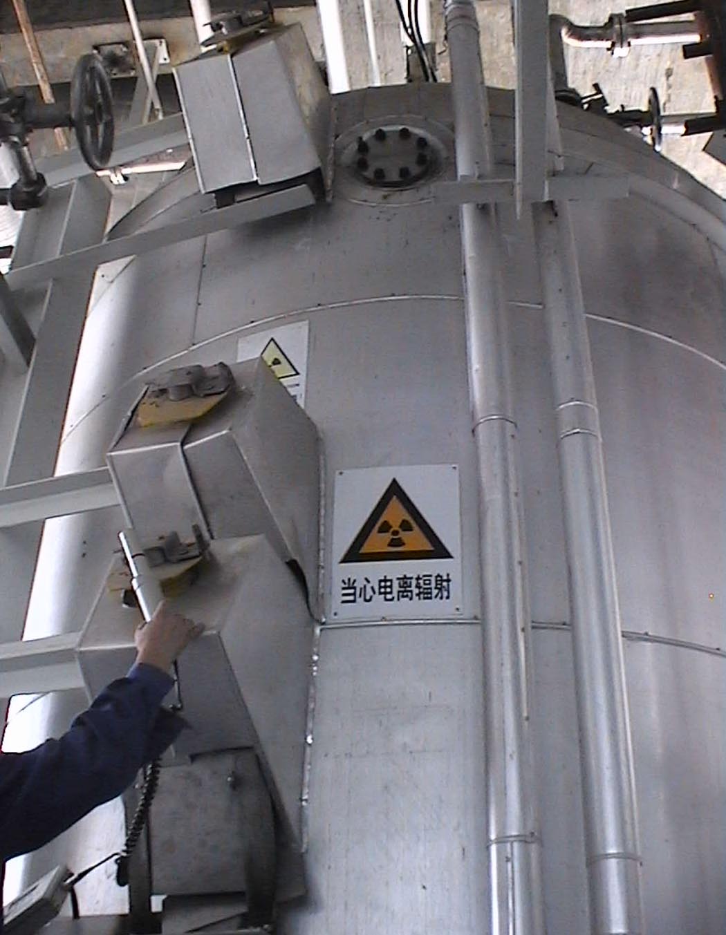 γ射线料位计是利用γ射线穿透物质时会有不同程度的吸收,因而产生射线强度的变化。容器内所装物料的量不同,对射线的吸收就不同,透过料仓后所探测到的射线强度就不同,从而确定容器中的物料,如液体、颗粒和碎屑等在料仓内的高度,即料位。放射源可以安装在被测量容器的外部,如球、罐、料仓、溜槽、管