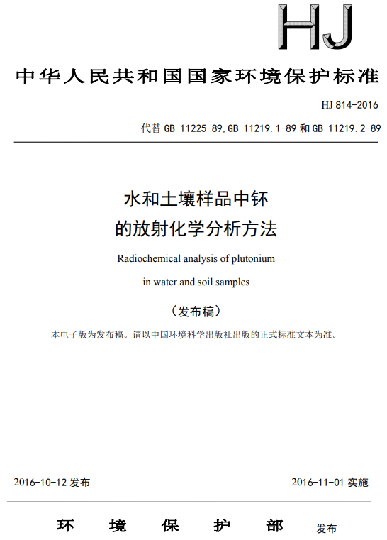 原文下载:水和土壤样品中钚的放射化学分析方法 HJ 814-2016