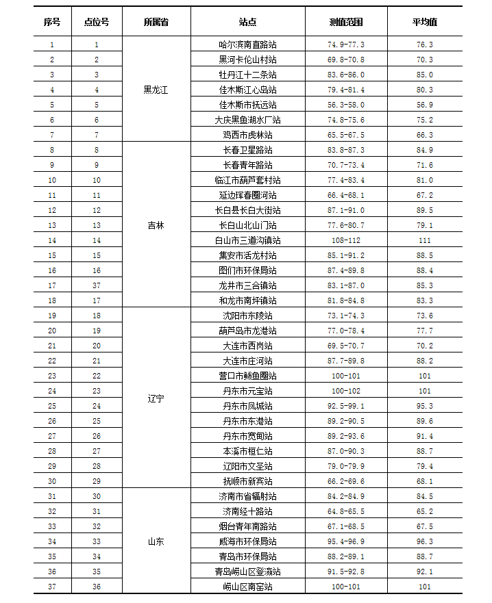 截至到1月13日6时,在东北边境及周边地区布设的37个辐射环境自动监测站实时连续空气吸收剂量率监测结果处于当地本底范围内。监测数据见表1。