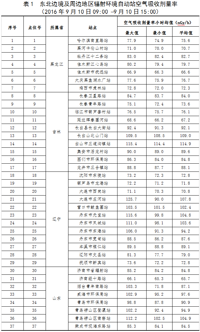 截至到9月10日15时,在东北边境及周边地区布设的37个辐射环境自动监测站实时连续空气吸收剂量率监测数据处于当地本底范围内。