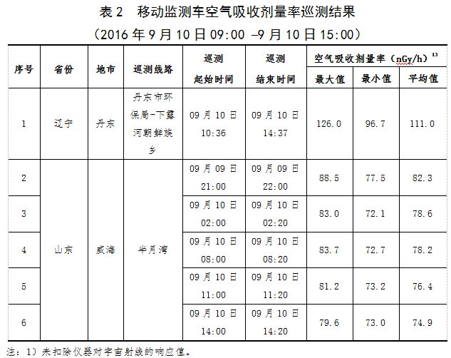 辽宁和山东2个省份2辆移动监测车巡测的空气吸收剂量率未见异常,处于当地本底涨落范围内。